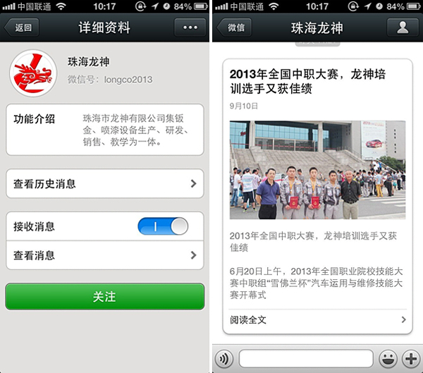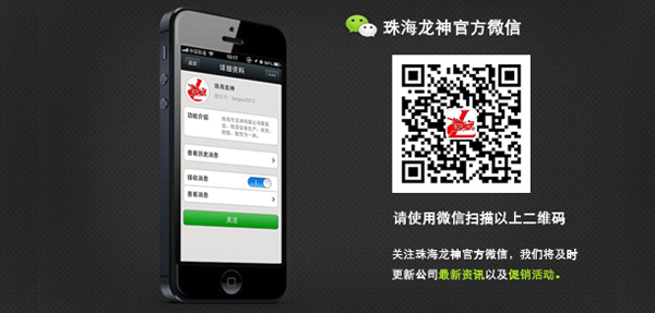珠海龍神官方微信敬請關注! 珠海市龍神有限公司公共微信號已申請成功,請大家多多關注! 掃描二維碼,也可直接搜索公眾微信號“珠海龍神” 我們將不定期發(fā)布公司最新資訊。 您也可以發(fā)消息和我們進行互動。 查看歷史消息收看您錯過的動態(tài)新聞,讓您第一手掌握最新動態(tài)。 2013-09-18 16453